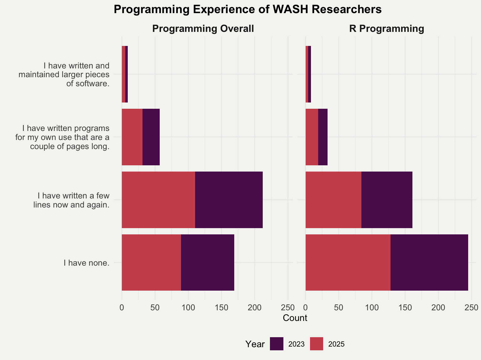 The survey data also shows varying levels of programming proficiency (see Figure Figure 2), with many researchers having limited experience with R specifically. This highlights the need for user-friendly tools that don’t require extensive programming knowledge. A primary barrier is the lack of accessible tools that simplify data publication and distribution using open-source software. This challenge motivated the creation of washr, an R package that streamlines the process of transforming raw data into publication-ready data packages using devtools utilities.