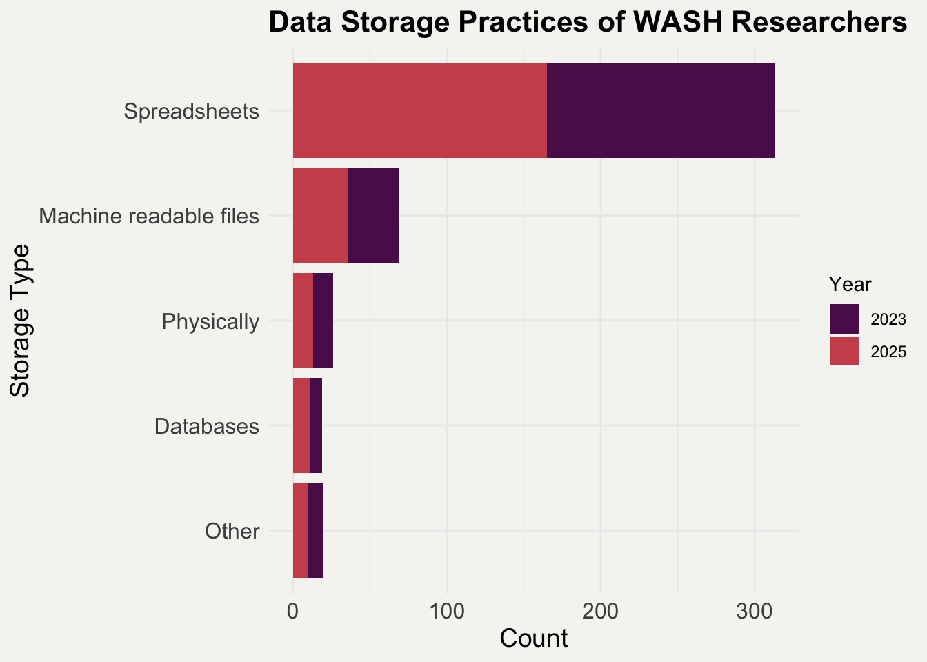 Working with Water, Sanitation, and Hygiene (WASH) researchers across multiple resource-limited countries, we observed that valuable datasets often remain underutilized. This is frequently due to limited familiarity with FAIR (Findable, Accessible, Interoperable, Reusable) data practices (Wilkinson et al. 2016). As part of the academic community, we recognize that research extends beyond traditional metrics like citations and publications. The demanding work of generating, collecting, and cleaning data frequently goes unrecognized, leaving many contributors unacknowledged. As part of GHE’s Open Science project openwashdata we conducted surveys with participants from our network of collaborators who were interested in participating in a Data Science for Open WASH Data course. The collected data reveals suboptimal data storage practices among WASH researchers, with many still relying on methods that hinder portability and interoperability (see Figure 1).